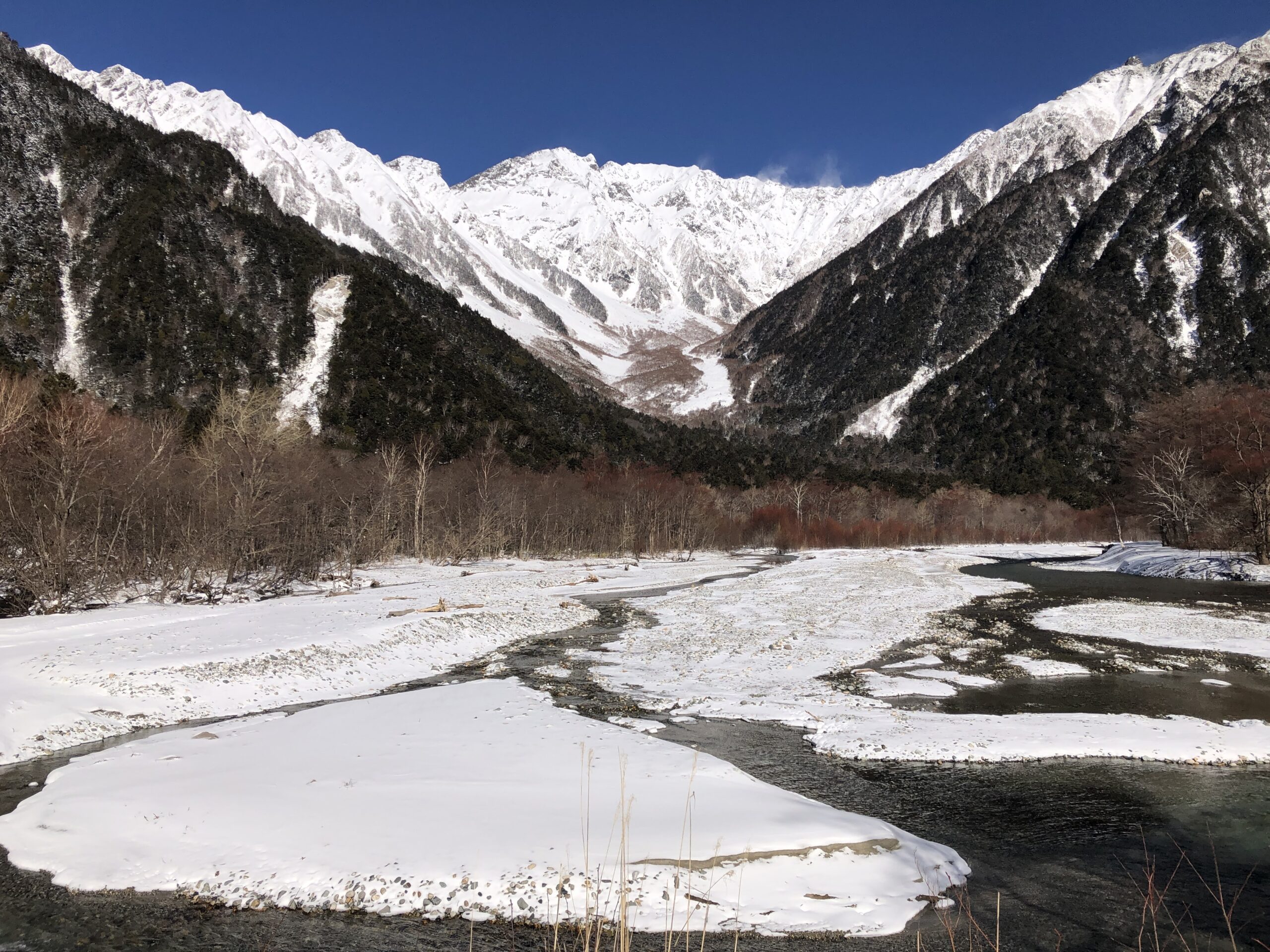 大正池の水面には、鏡面のように美しい焼岳が映し出され、雪をまとった白銀の穂高連峰は、まさに荘厳です。