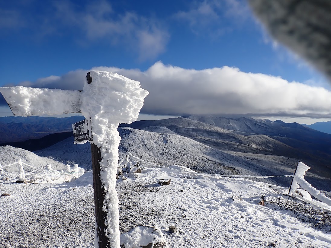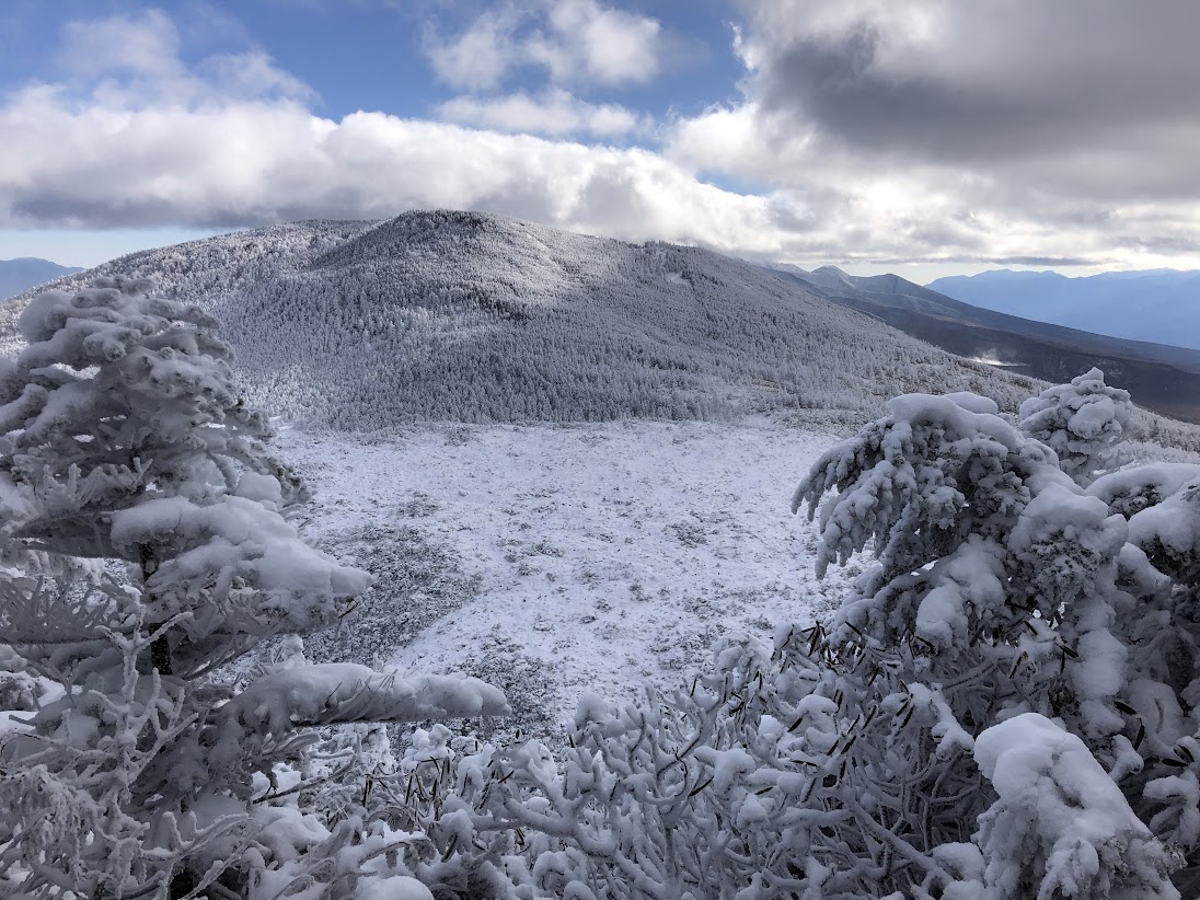 雪をまとったシラビソの森を抜け、山頂に立てば素晴らしい景色が広がります。