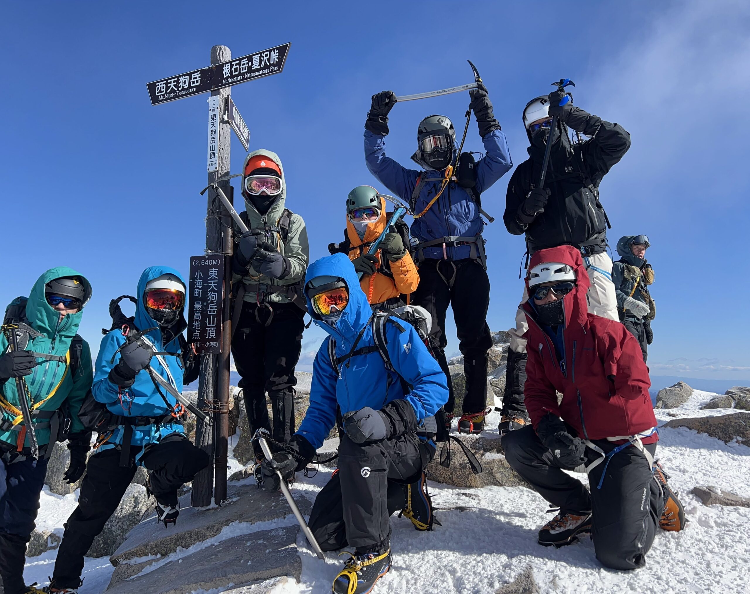 険しい岩場をアイゼンとピッケルを使いこなし、東天狗と西天狗岳のピークを目指します。