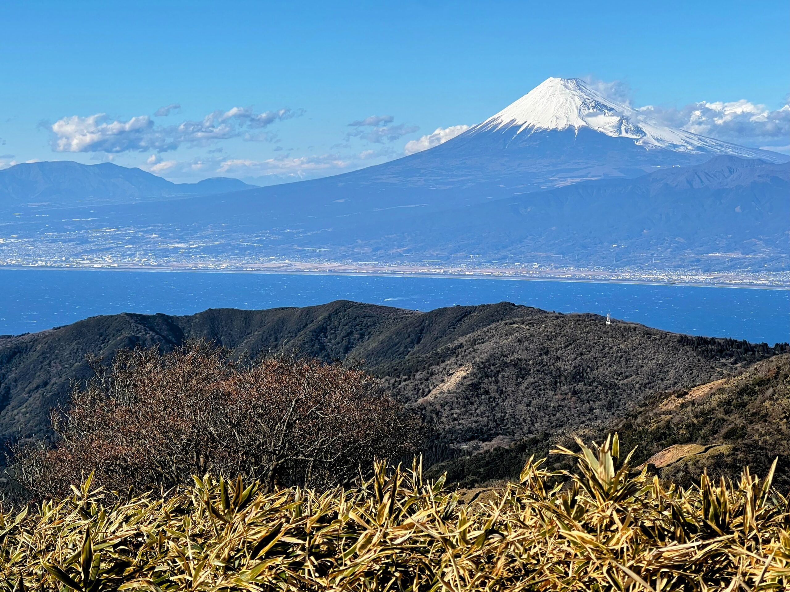 青く輝く駿河湾と、その先にそびえる富士山の雄大な姿を